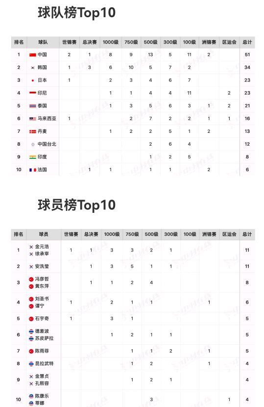 随着昨日年终总决赛落幕,世界羽联巡回赛2025赛季全部比赛结束。2025冠军统计榜单出炉,在球队榜中国羽以51枚金牌高居榜首,球员榜则由韩国的金元浩/徐承宰、安洗莹各夺得11枚金牌包揽前二
